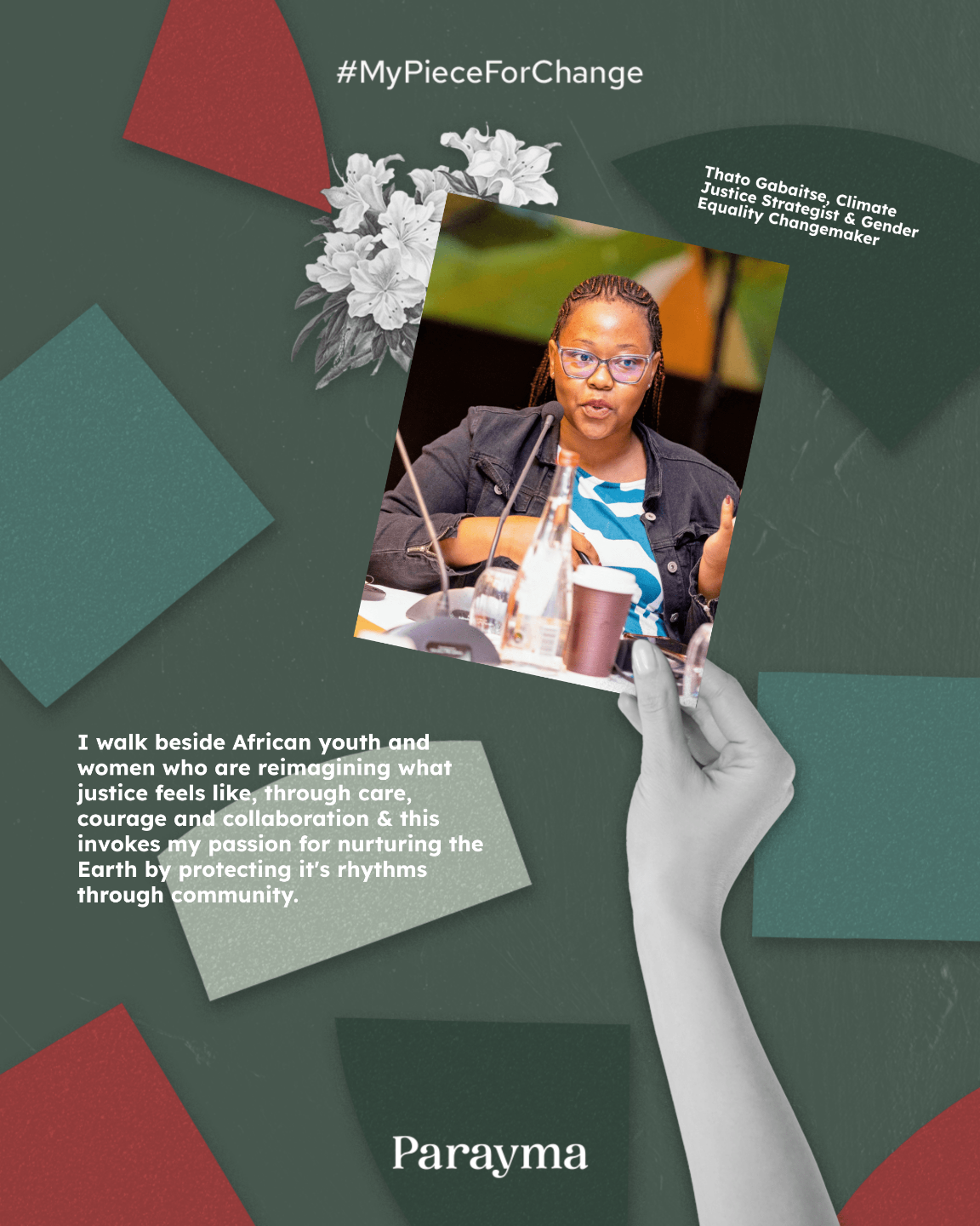 "I walk beside African youth and women who are reimagining what justice feels like, through care, courage and collaboration & this invokes my passion for nurturing the Earth by protecting it's rhythms through community."